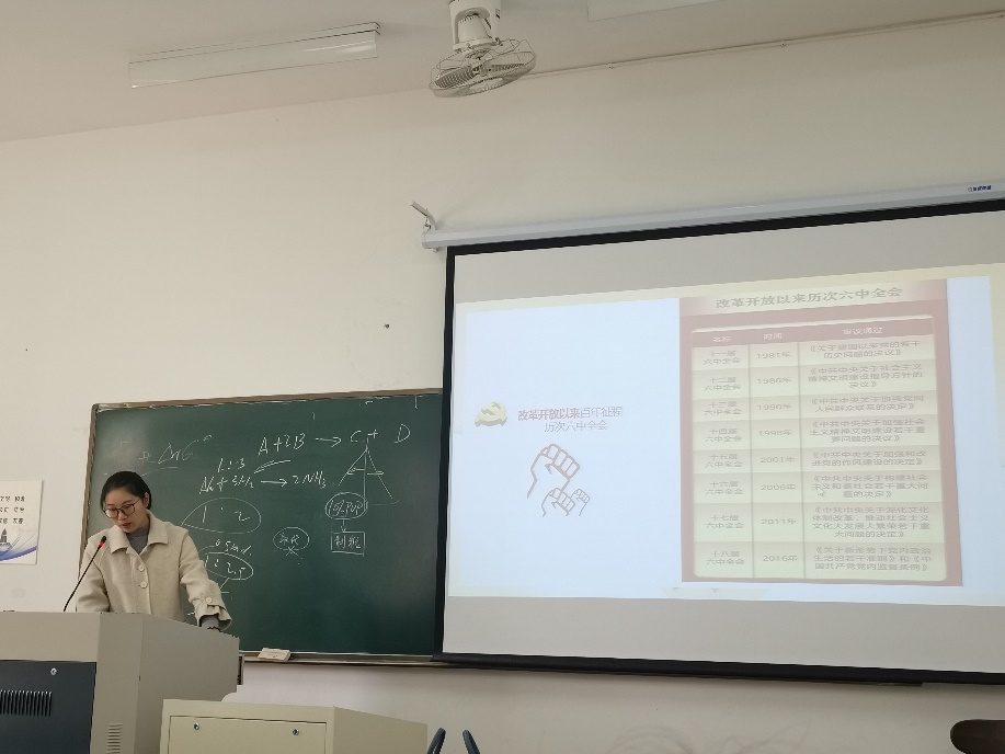 王培蕾老师从十九届六中全会的概况、召开的重要意义、六中全会看点以及学习贯彻其精神等四个方面带领我们深刻解读了十九届六中全会的内涵。她强调,十九届六中全会是一场具有全局性,历史性意义的重要会议,更是新时代共产党人牢记初心使命,坚持和发展中国特色社会主义的政治宣言。每位党员都应深刻把握使命任务,贯彻落实全会重要精神。