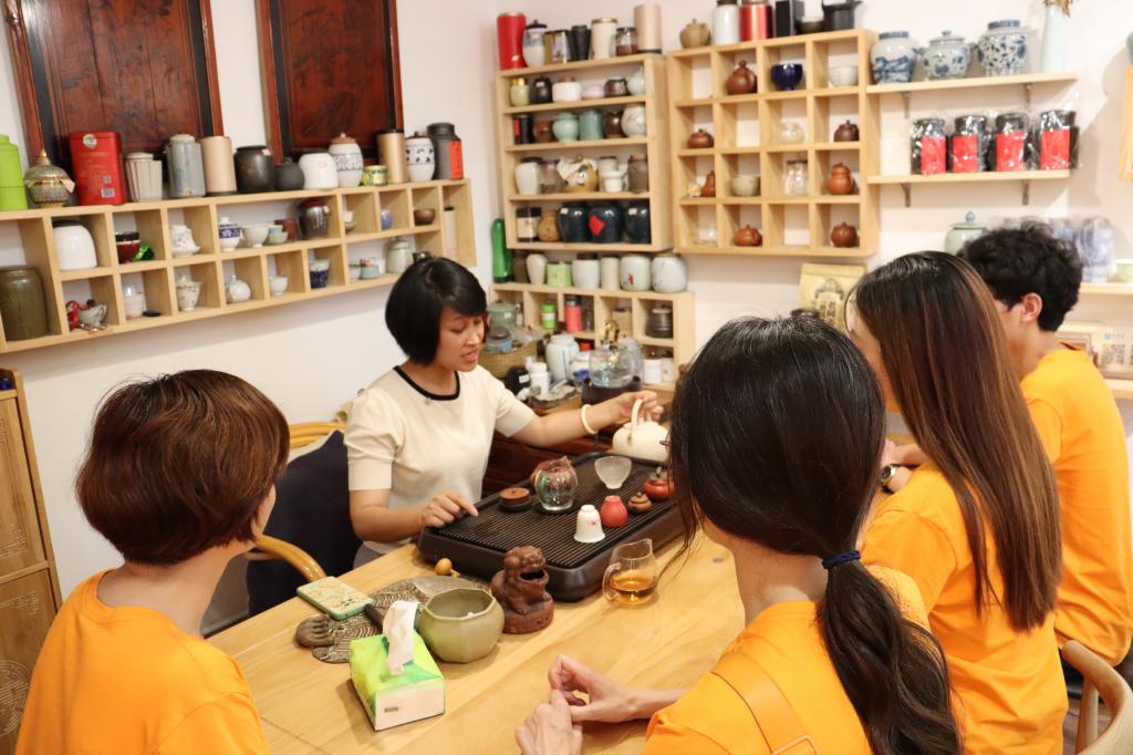 为更好发挥大陈岛远离闹市、宁静致远的特点,探索大陈岛特色慢生活的共富新模式,m88官方网站心湖书院与明胜m88官网联合组织的“共富海岛垦荒行”社会实践队,在生命科学公司党委副书记、心湖书院导师徐敏的带领下,于6月29日走进椒江道台里非遗文化一条街,探访茶系慢生活。