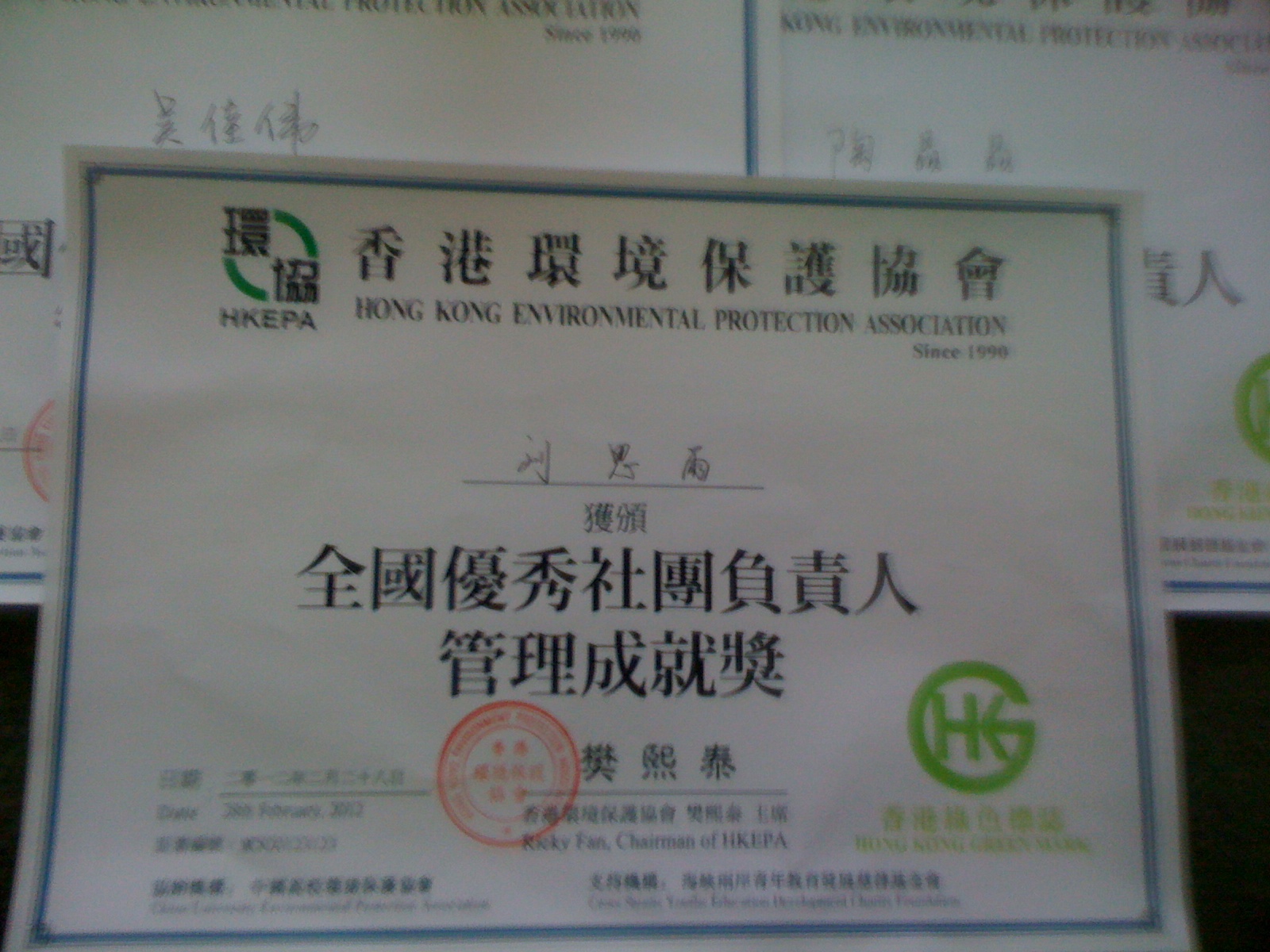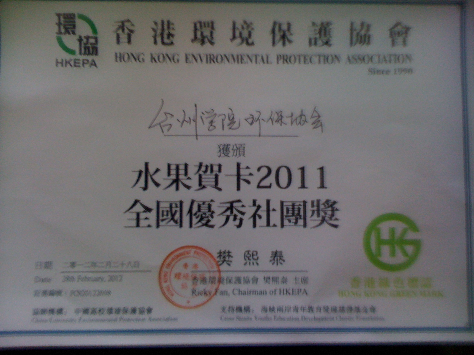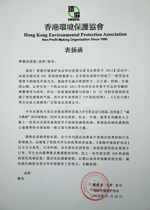 3月27日,明胜m88官网分团委、员工会收到一封来自香港的特别信函。公司环保协会在香港环境保护协会主办、中国高校环境保护协会协办的第五届“水果贺卡2011”活动中,荣获“全国优秀社团奖”,刘思雨、吴佳伟及陶晶晶等3位同学荣获“全国优秀社团负责人管理成就奖”。