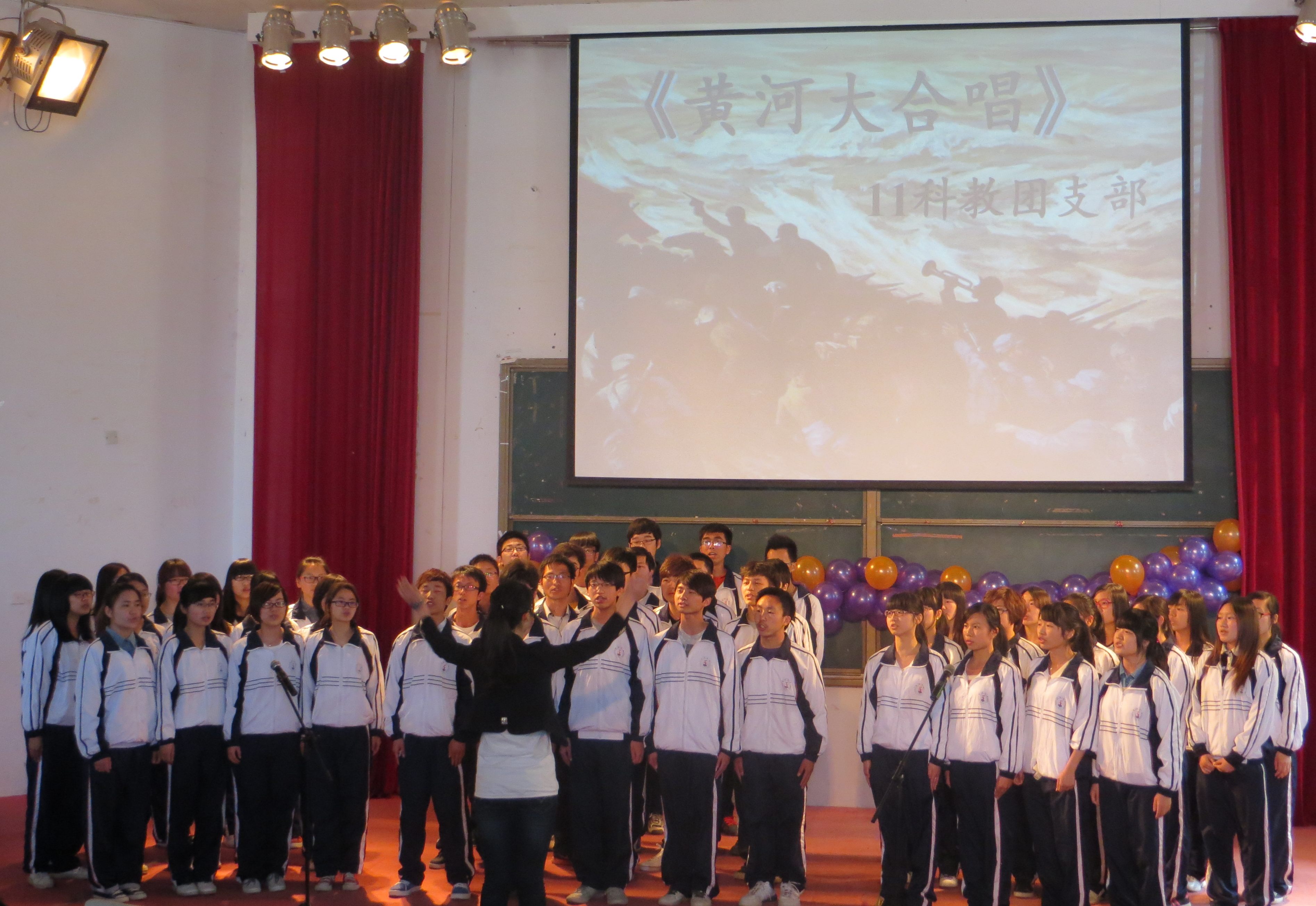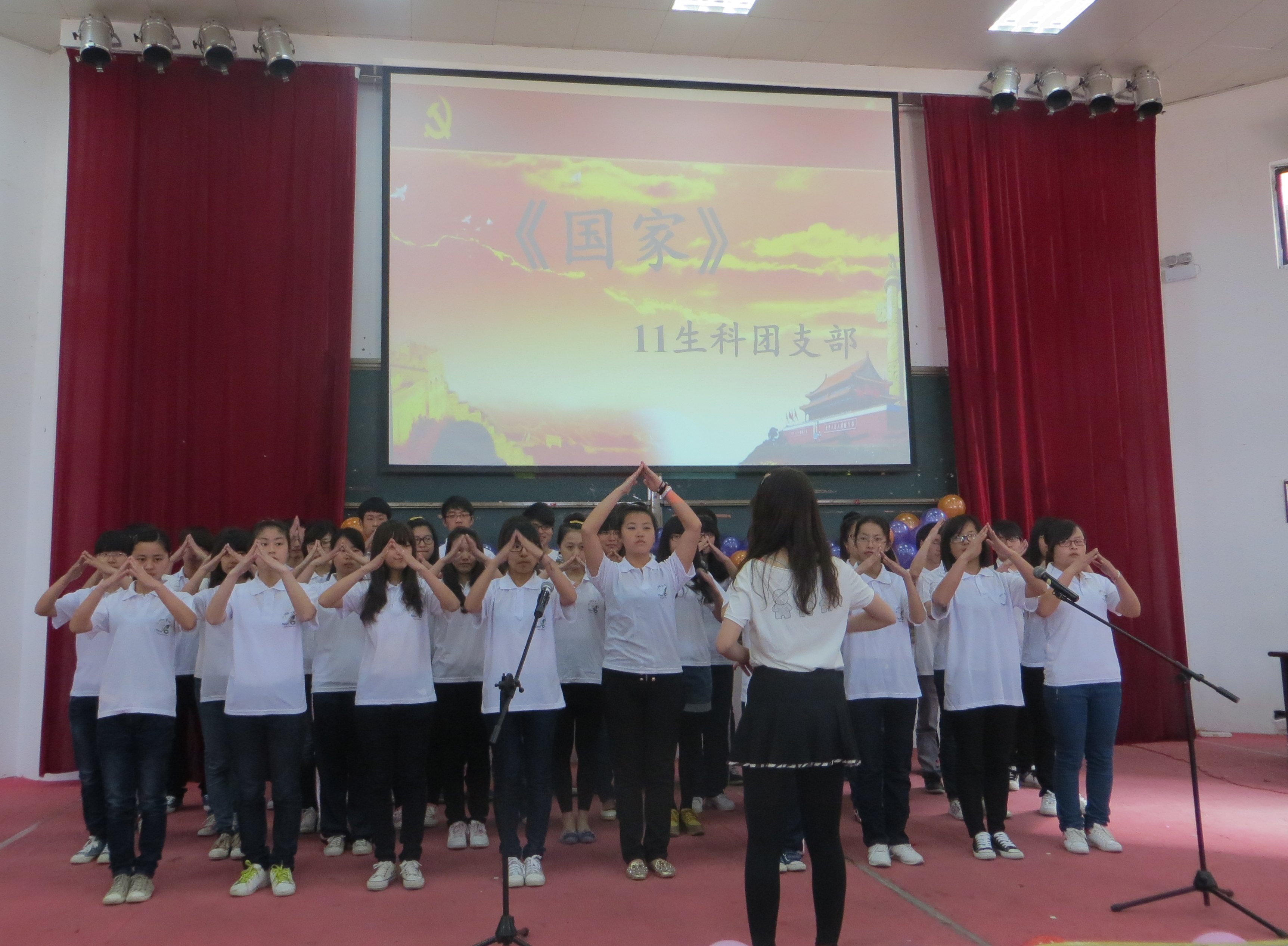 比赛现场激情洋溢,来自各班级团支部的代表队以饱满的精神状态与颇具特色的演唱形式,合唱了《歌唱祖国》、《精忠报国》、《爱我中华》、《黄河大合唱》等脍炙人口的红色革命歌曲。同学们整齐统一的服装、热情饱满的精神姿态,彰显年轻一代的青春风貌;声情并茂的演唱以及对革命的无限情怀将歌曲演绎的淋漓尽致,赢得了场上观众的阵阵鼓掌;小嘉宾甜美领唱的新颖形式与整齐的国旗布阵,博得了在场评委及同学们的好评。激昂嘹亮的歌声,新颖的演唱形式,如火的热情,表达出同学们对党和祖国的热爱。最终,12级科学教育班团支部代表队以94分的绝对优势摘得桂冠。