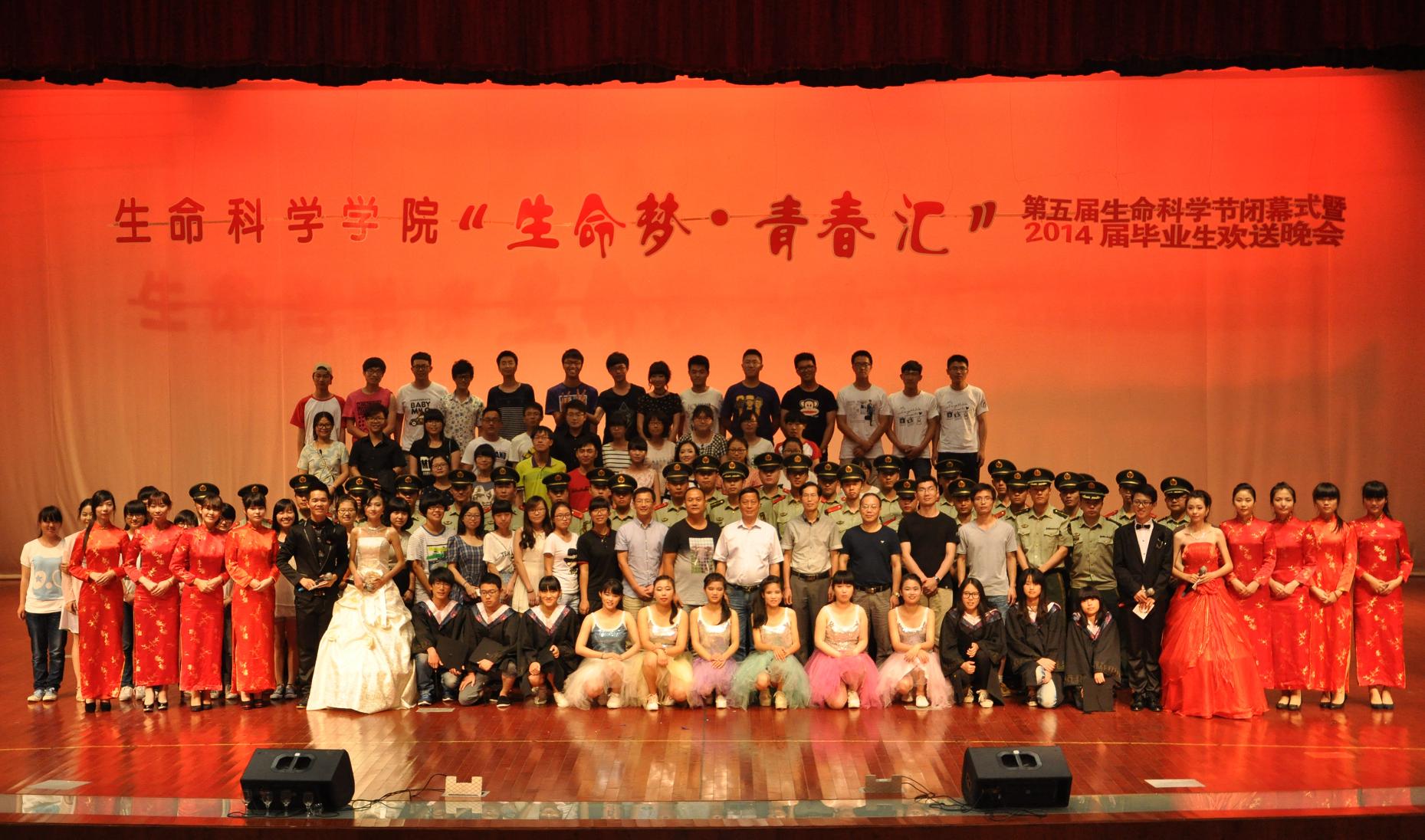毕业犹在即,青春不散场。为重温师生情,欢送毕业生,6月15日晚,明胜m88官网在椒江校区大会堂隆重举办“生命梦•青春汇”第五届生命科学节闭幕式暨2014届毕业生欢送晚会。公司经理施时迪教授、党总支书记王金宝教授、副经理柯世省教授、党总支副书记杨启富副研究员、副经理孙长森副教授、校保卫处副处长马斌老师及台州边防检查站的军官同志们应邀出席与千余名员工一同观看晚会。