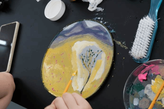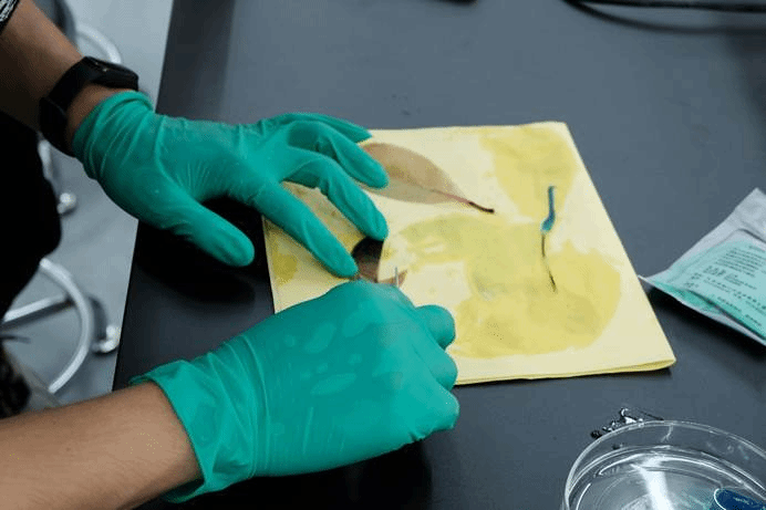 活动伊始,人类自然协会讲解员详细介绍叶脉书签与叶贴画制作流程,并告知活动规则及注意事项。各位参赛同学认真学习实验药剂的使用方法,谨记实验仪器的规范使操作和安全注意事项。随后,同学们便利用工具开始制作,新鲜叶片在同学们手中先后经历浸泡、预加热后,颜色由绿变黄,再通过双氧水浸泡后叶片被漂白。同学们用牙刷小心去除叶肉,留下叶脉风吹晾干并定型。大家大胆发挥想象,用各种颜料配合树叶在团扇上绘制图案,制作出各式各样精美的叶脉书签与扇形叶贴画。