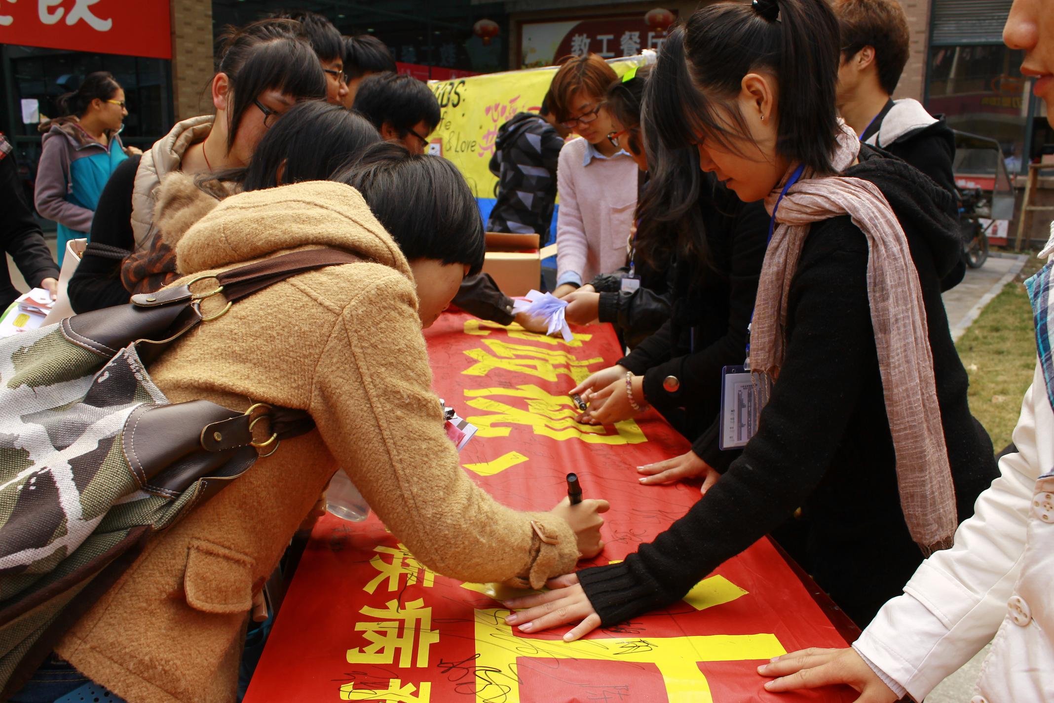 11月26日,明胜m88官网人类自然协会在椒江校区食堂门口举办了艾滋病主题宣传活动。 此次活动包括了“横幅签名”和“有奖问答”两个部分,凡是参加活动的人均可获得人协提供的小礼品一份。签名活动吸引了广大师生前来...